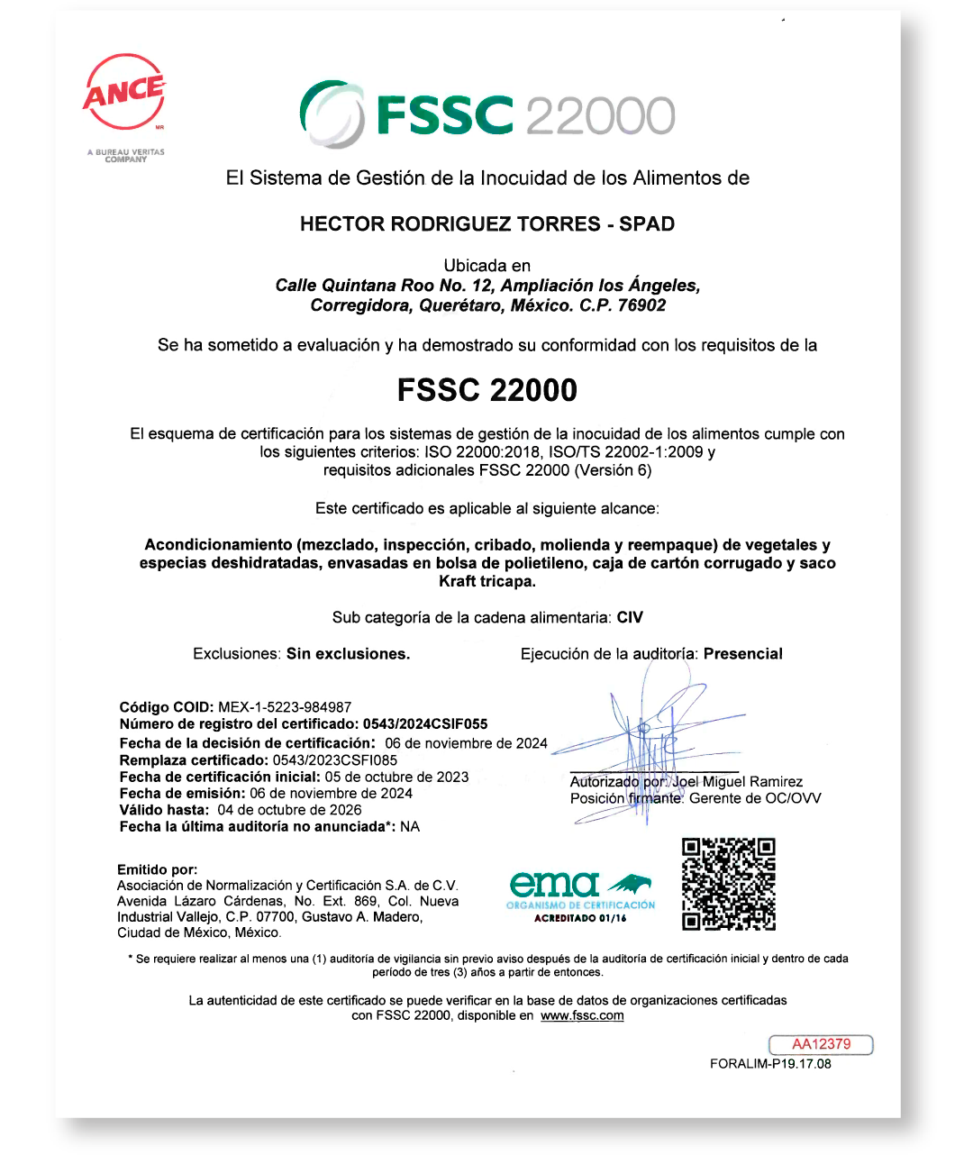 Comprometidos en cumplir los lineamientos de Calidad e Inocuidad, trabajamos conforme al esquema de certificación para los sistemas de gestión de la inocuidad de los alimentos que cumple con los siguientes criterios: ISO 22000:2018. ISO/TS 22002-1:2009 y requisitos adicionales FSSC 22000 (versión 6).